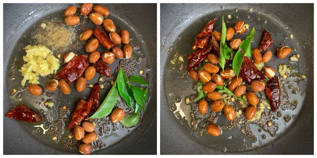 नंतर त्यात मोहरी आणि सुकलेल्या लाल मिरच्या घालून घ्या व मोहरी फुटेपर्यंत त्यांना परता.