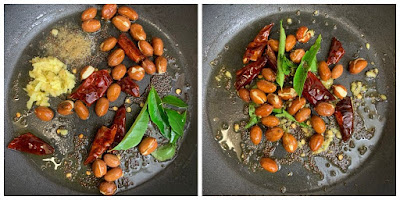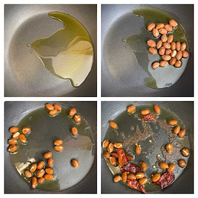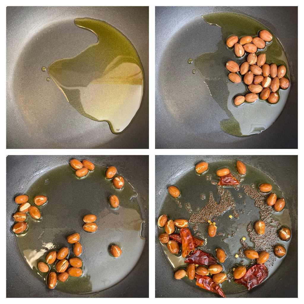 कढईत तूप किंवा खोबरेल तेल गरम करा व तेल गरम झाल्यावर कच्चे शेंगदाणे घाला आणि मस्त लालसर होईपर्यंत परतून घ्या
